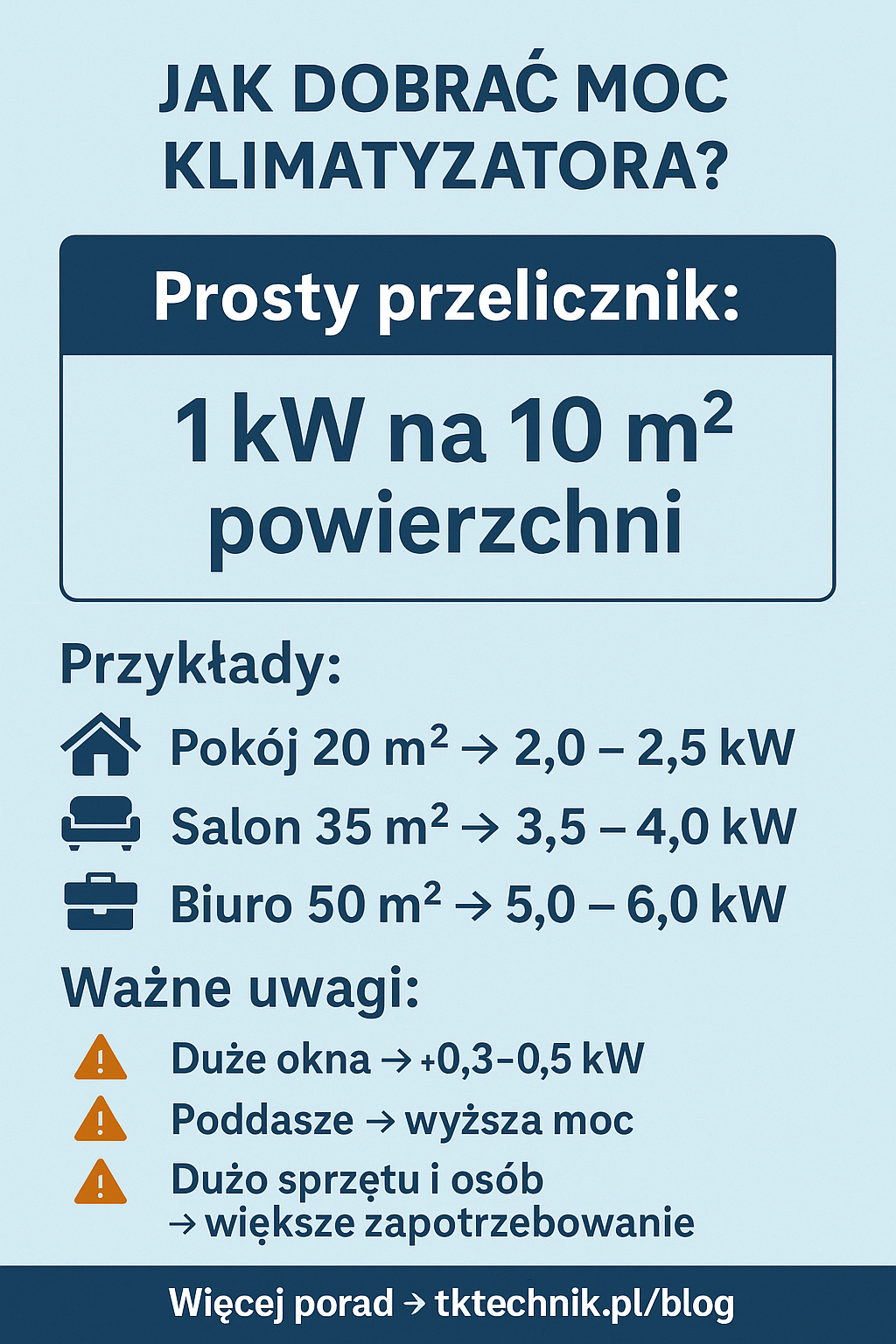 Dobór klimatyzatora nie powinien być przypadkowy. Warto skorzystać z prostego przelicznika (1 kW na 10 m²), ale pamiętać też o dodatkowych czynnikach, takich jak nasłonecznienie czy liczba osób.